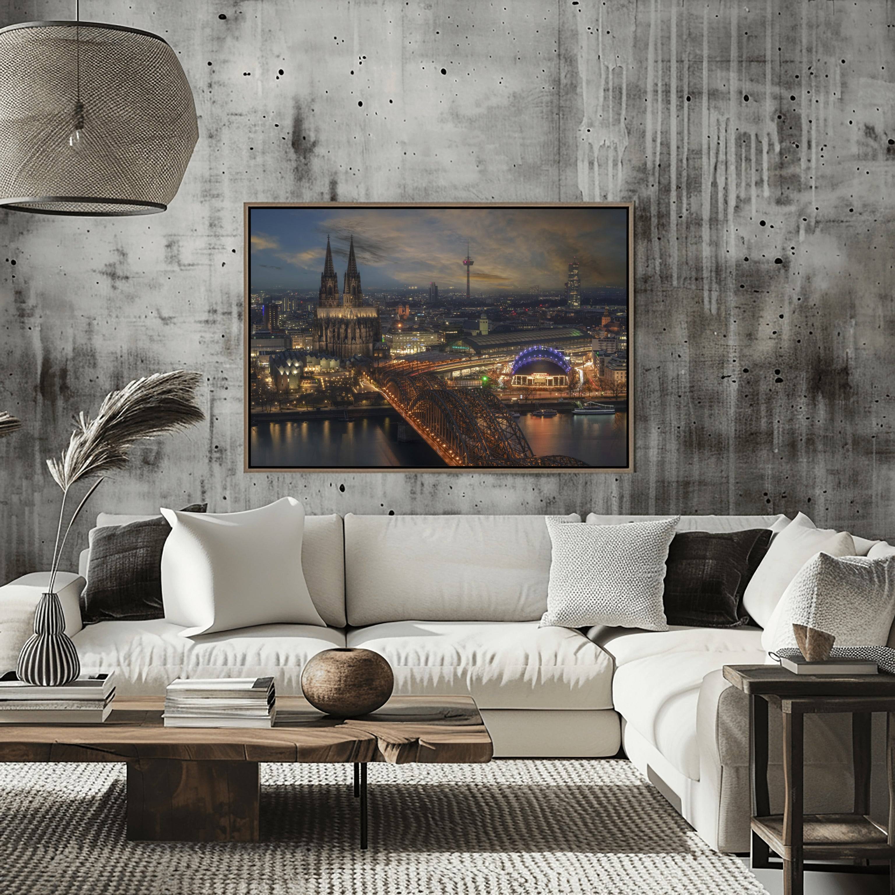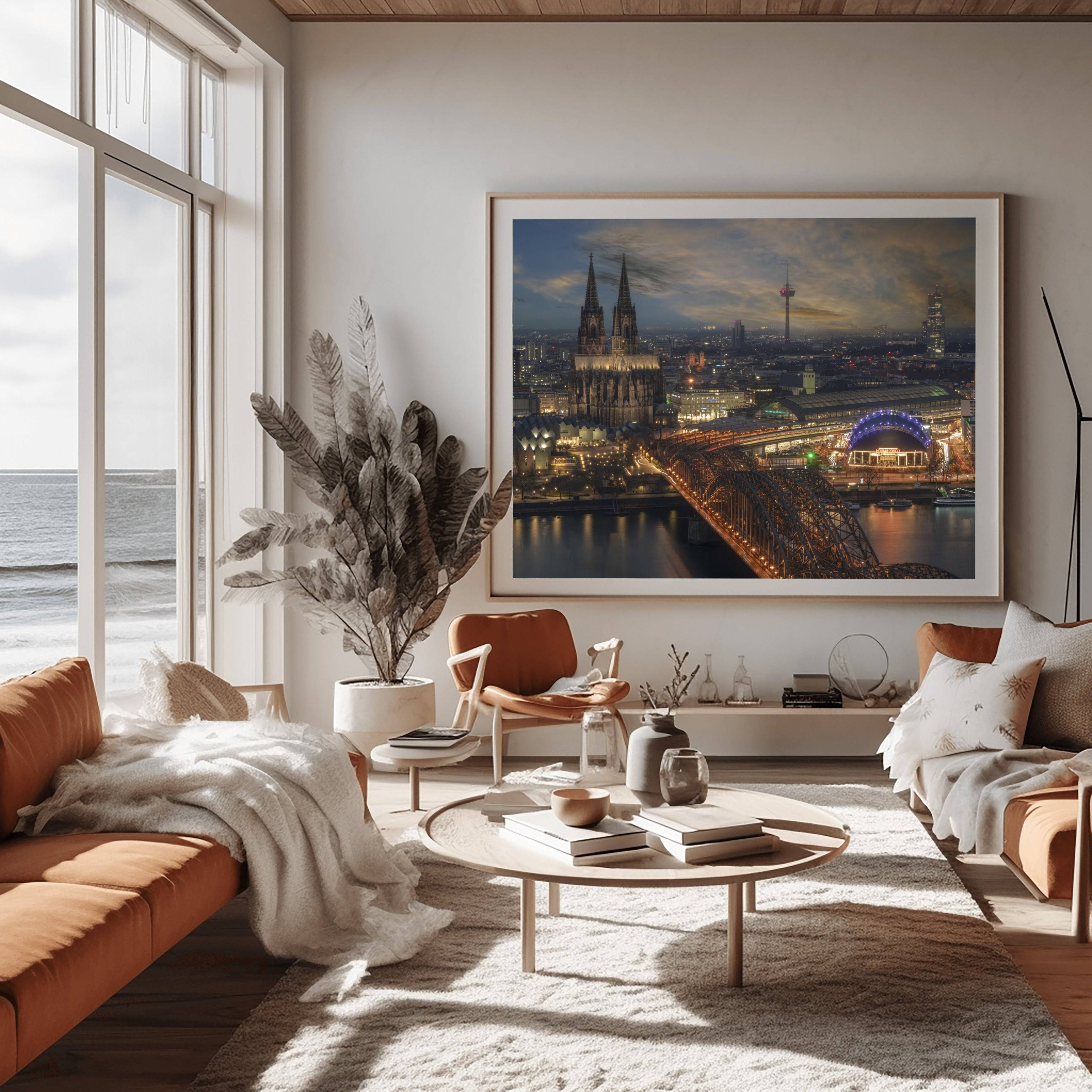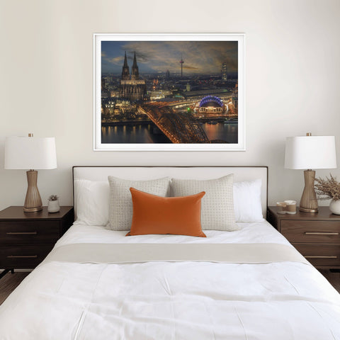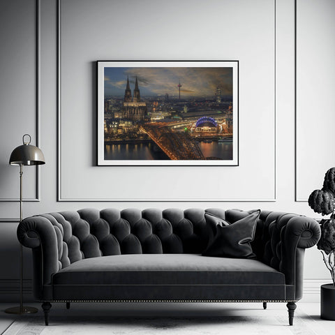 Dominating the horizon with its twin Gothic spires, the Cologne Cathedral stands as a testament to architectural endurance in this stunning skyline view of Cologne, Germany. This fine art photograph captures the city’s historic heart from across the Rhine River, where the massive silhouette of the Kölner Dom meets the industrial elegance of the Hohenzollern Bridge. As the evening light settles over the cityscape, the cathedral’s intricate stone masonry is cast in a dramatic glow, highlighting its status as one of the most visited landmarks in Europe and a UNESCO World Heritage site.