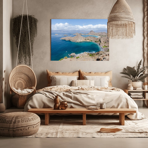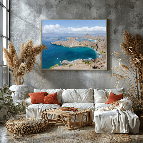 Located within the Coral Triangle, Komodo National Park is a prehistoric world of volcanic islands and crystal-clear waters. This photograph, taken from the iconic Padar Island viewpoint, captures the island's unique "dragon-spine" topography, where jagged savanna-covered hills plunge into three magnificent bays—each featuring a different colored sand, from white to charcoal to rare pink.