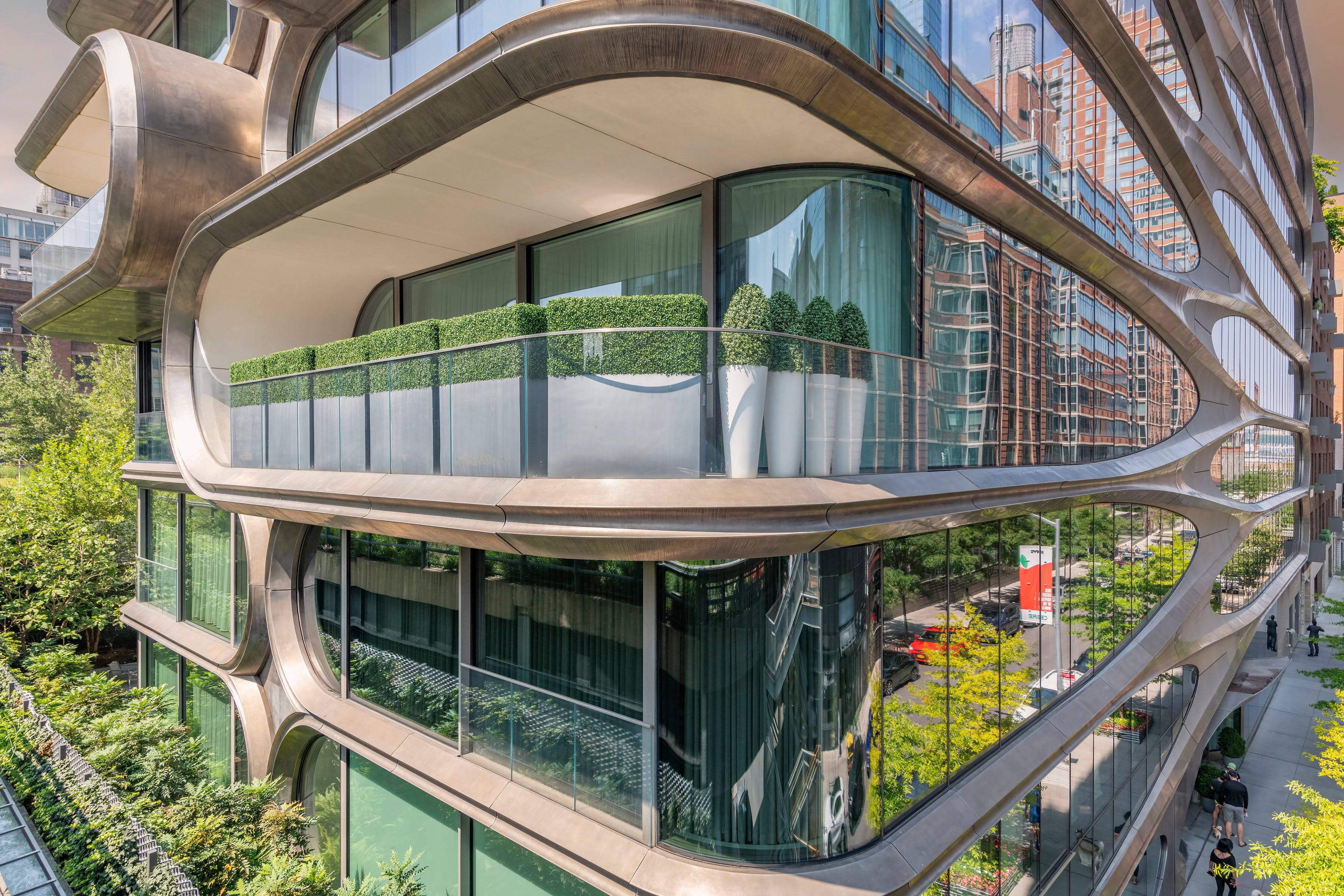 Marking the only permanent trace of Zaha Hadid's genius in New York, this sculptural glass masterpiece brings fluid, futuristic curves to the historic High Line. The photograph focuses on the interlocking metal bands and hand-rubbed steel that give the building its organic, almost liquid appearance. Situated in the heart of the Chelsea art district, the structure stands as a bold challenge to the traditional box-like skyscrapers of Manhattan.