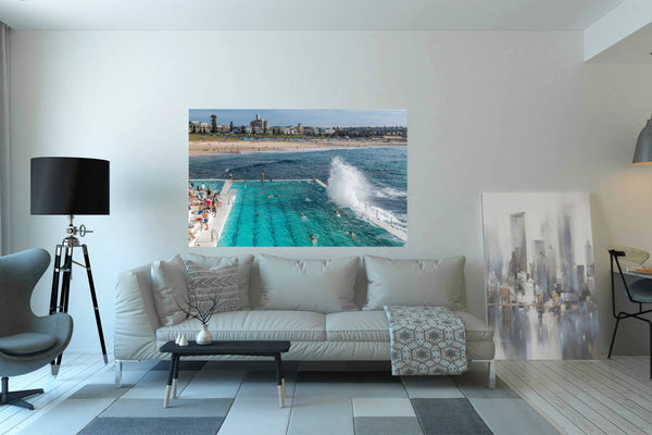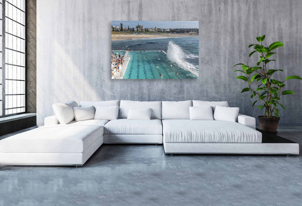 The raw power of the Pacific Ocean meets the clean, white lines of the Bondi Icebergs Pool in this captivating shot of Sydney’s most famous coastal landmark. This photograph captures the exact moment a massive wave crests over the pool's edge, sending a spray of white foam into the turquoise water below. It is a stunning display of the intersection between man-made architecture and the untamed force of the sea, a sight that has made Bondi Beach a global icon.