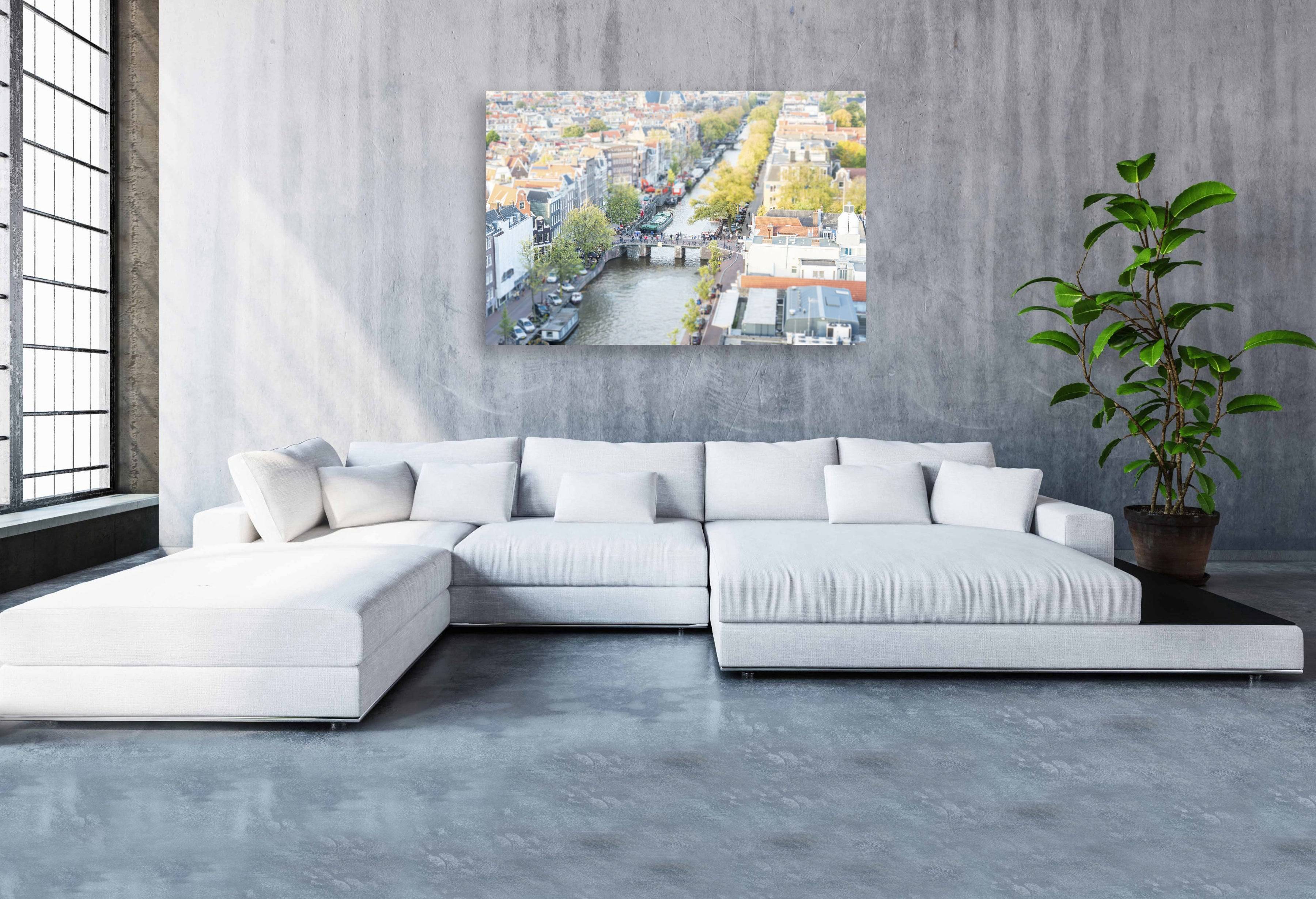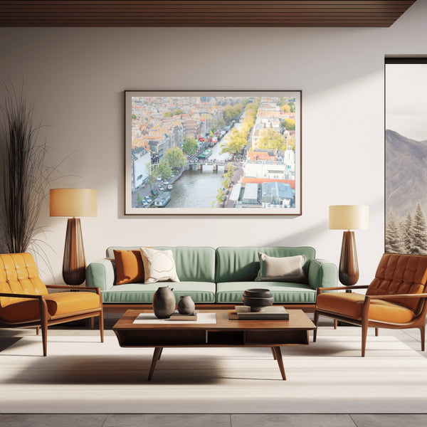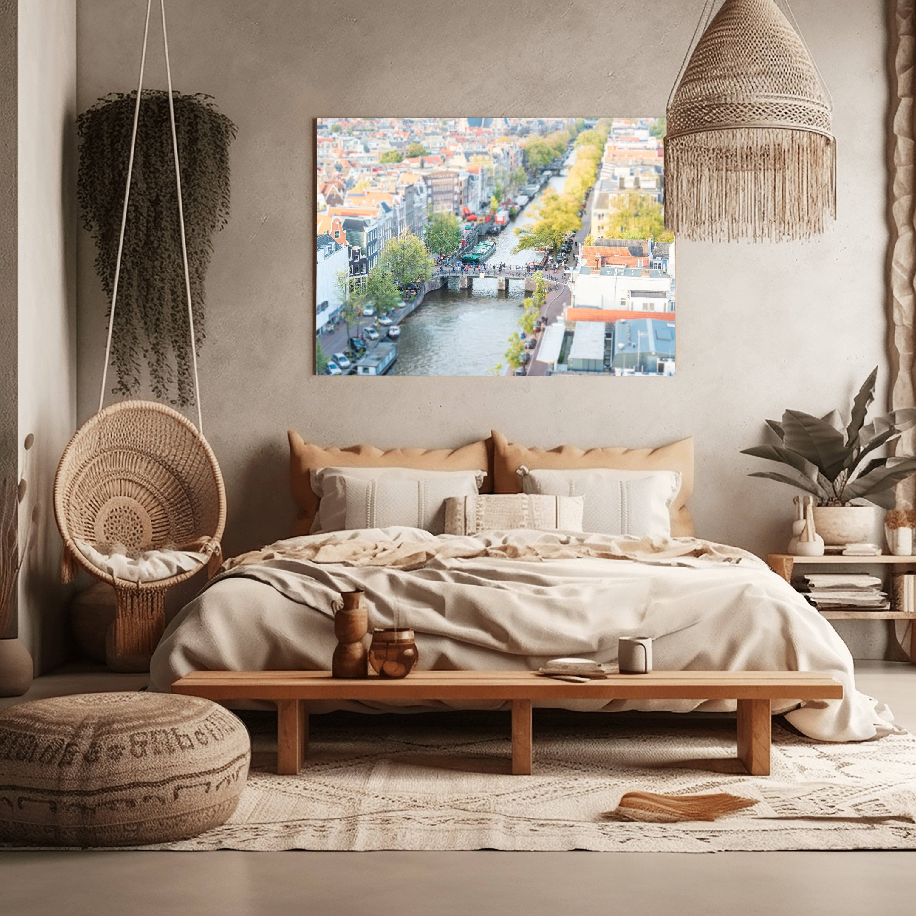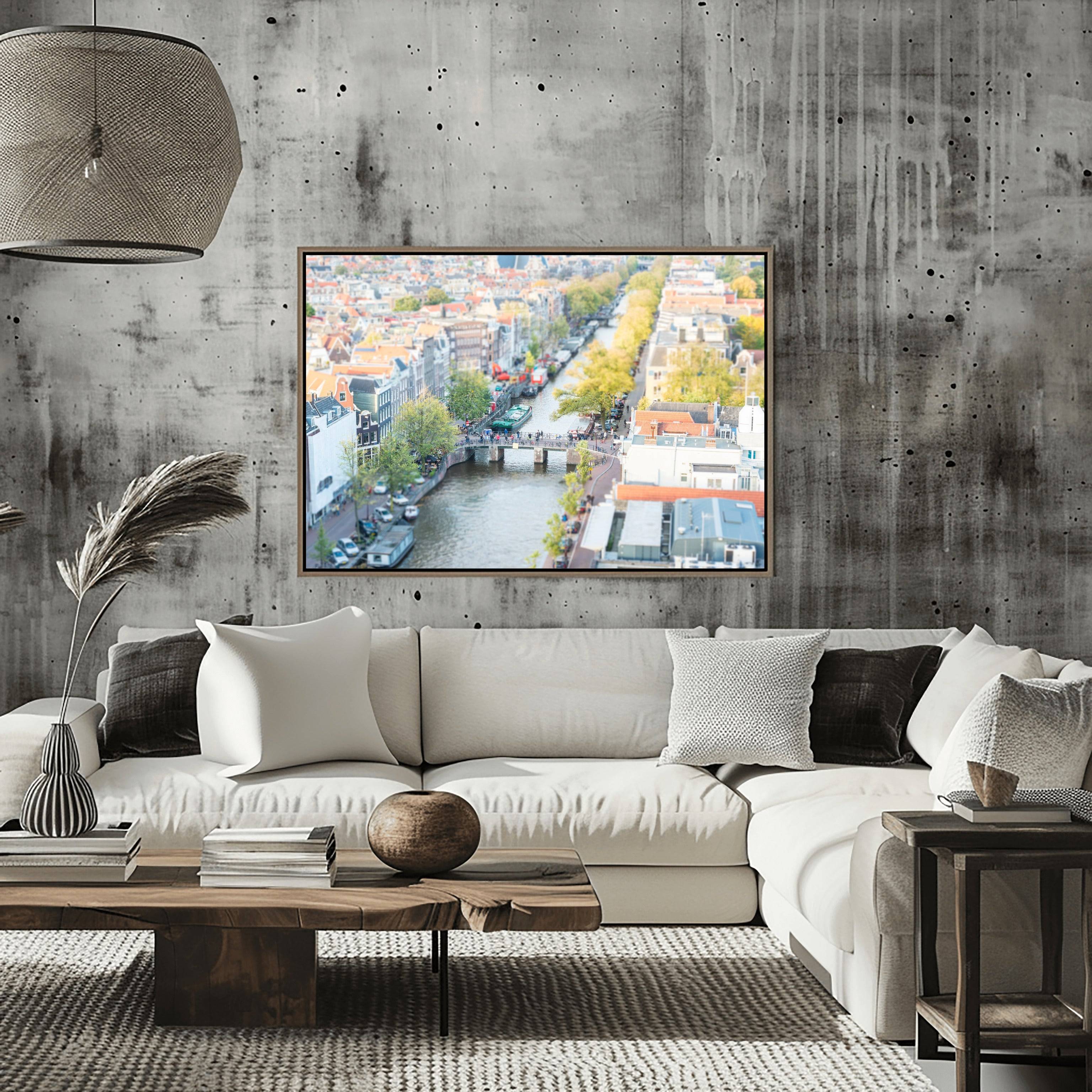This photograph celebrates the architectural heritage of the Netherlands with a touch of whimsy. The rich, earthy tones of the brickwork and the reflective greens of the canal water create a sophisticated yet playful aesthetic. It is a wonderful addition to a study or a classic interior, offering a window into a "tiny" version of one of Europe’s most beloved cities.