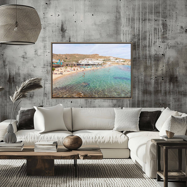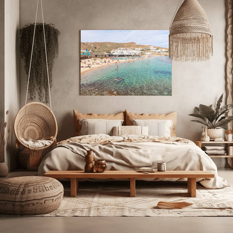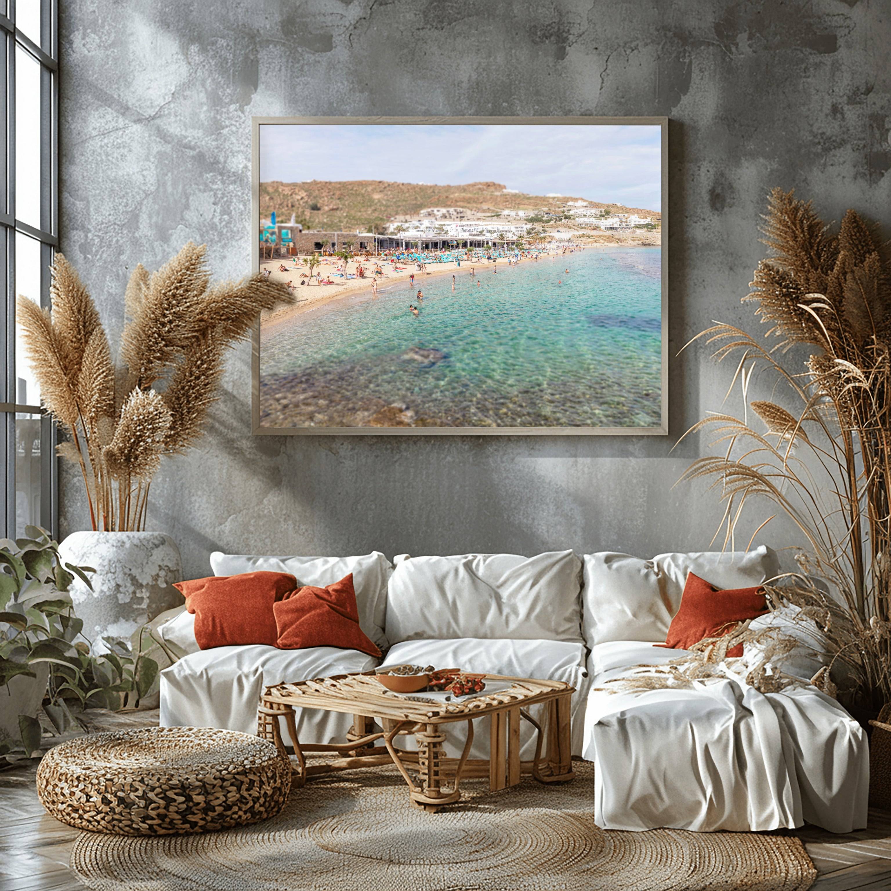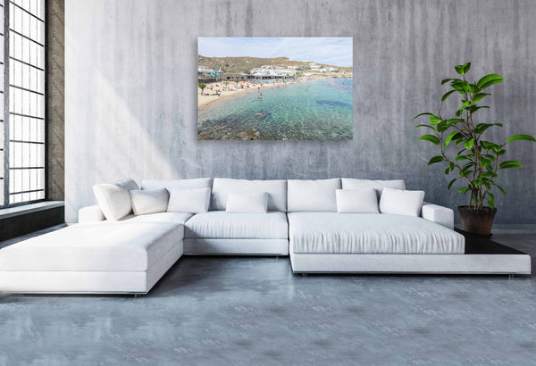 The image radiates Mediterranean warmth and a high-summer aesthetic, making it perfect for coastal-themed interiors or bright, modern spaces. By shrinking the world-famous Paradise Beach, Silver highlights the rhythmic beauty of Greek architecture and the stunning clarity of the water, creating a piece that feels both luxurious and whimsical.