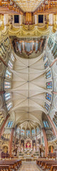 The Basilica of the Blessed Sacrament (Basílica del Santísimo Sacramento) is one of the most opulent religious structures in Buenos Aires. This vertical panorama captures the church’s transition from its dark, polished wooden pews to the luminous, gold-leafed carvings of the altar and the soaring vaulted ceiling. The symmetry of the architecture is brought to life through this unique 180-degree perspective, highlighting the French-inspired Neoclassical and Gothic revival details.