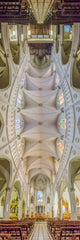 The Church of the Infant Jesus of Prague in Santiago is renowned for its striking interior color palette. This vertical panorama highlights the beautiful cobalt blue and gold vaulting that makes the ceiling appear like a starry sky. The perspective creates a powerful sense of elevation, drawing the viewer from the quiet nave into the vibrant celestial colors of the roof.