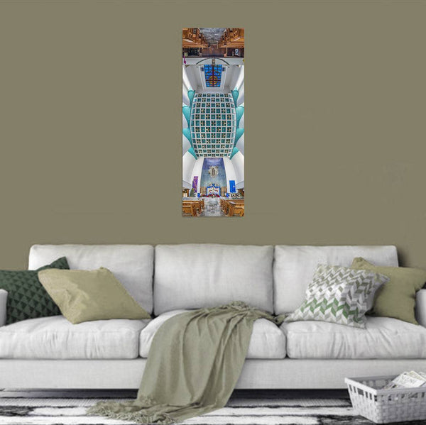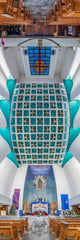 This Mexico City church is a hidden marvel of mid-century modernist design. The vertical panorama showcases the innovative use of light and concrete, where sharp geometric angles create a play of shadow and illumination. The perspective emphasizes the church's unique triangular vaulting and its clean, contemporary altar.