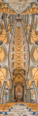 Salisbury Cathedral is the definitive example of Early English Gothic architecture. This vertical panorama highlights the cathedral's famous "forest" of dark Purbeck marble columns and its clean, soaring stone vaulting. The image captures the incredible precision and verticality that made this building a marvel of the 13th century.