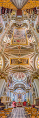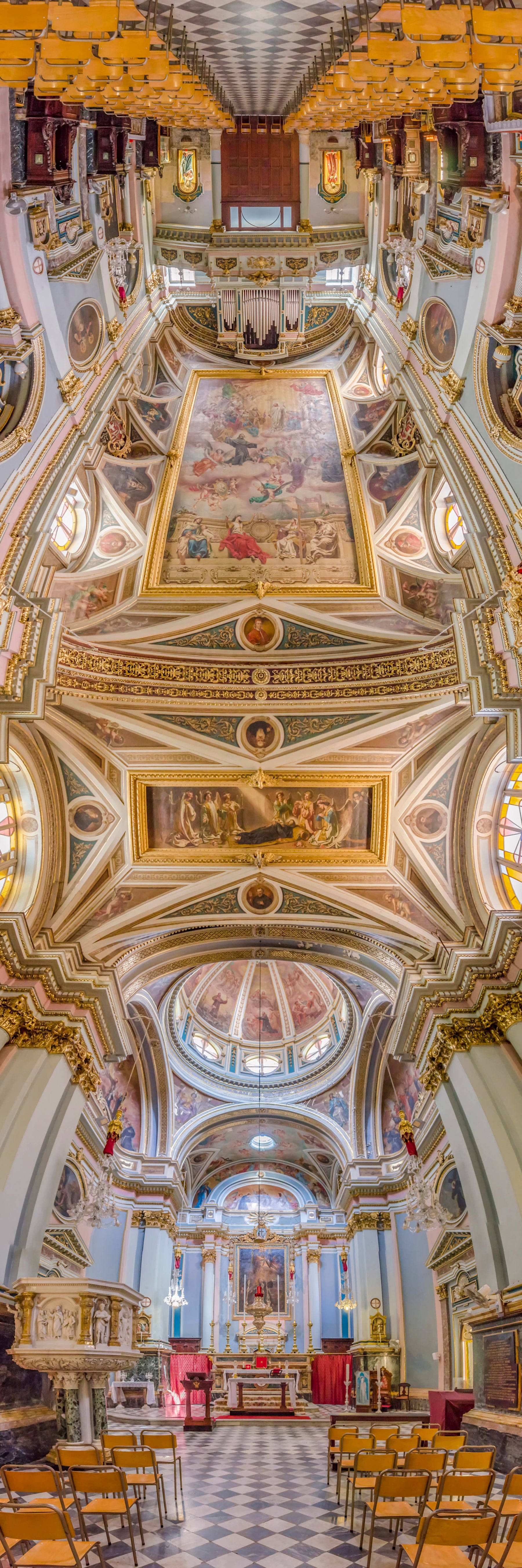 The Church of St. Francis of Assisi in Valletta is a testament to the wealth and artistry of the Knights of Malta. This vertical panorama highlights the exuberant Baroque decoration, with its thick gold leafing and detailed ceiling paintings. The perspective captures the church’s sense of royal spiritual power, leading from the altar to the ornate vaulting.