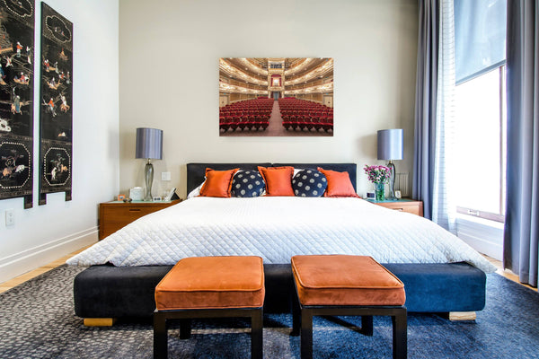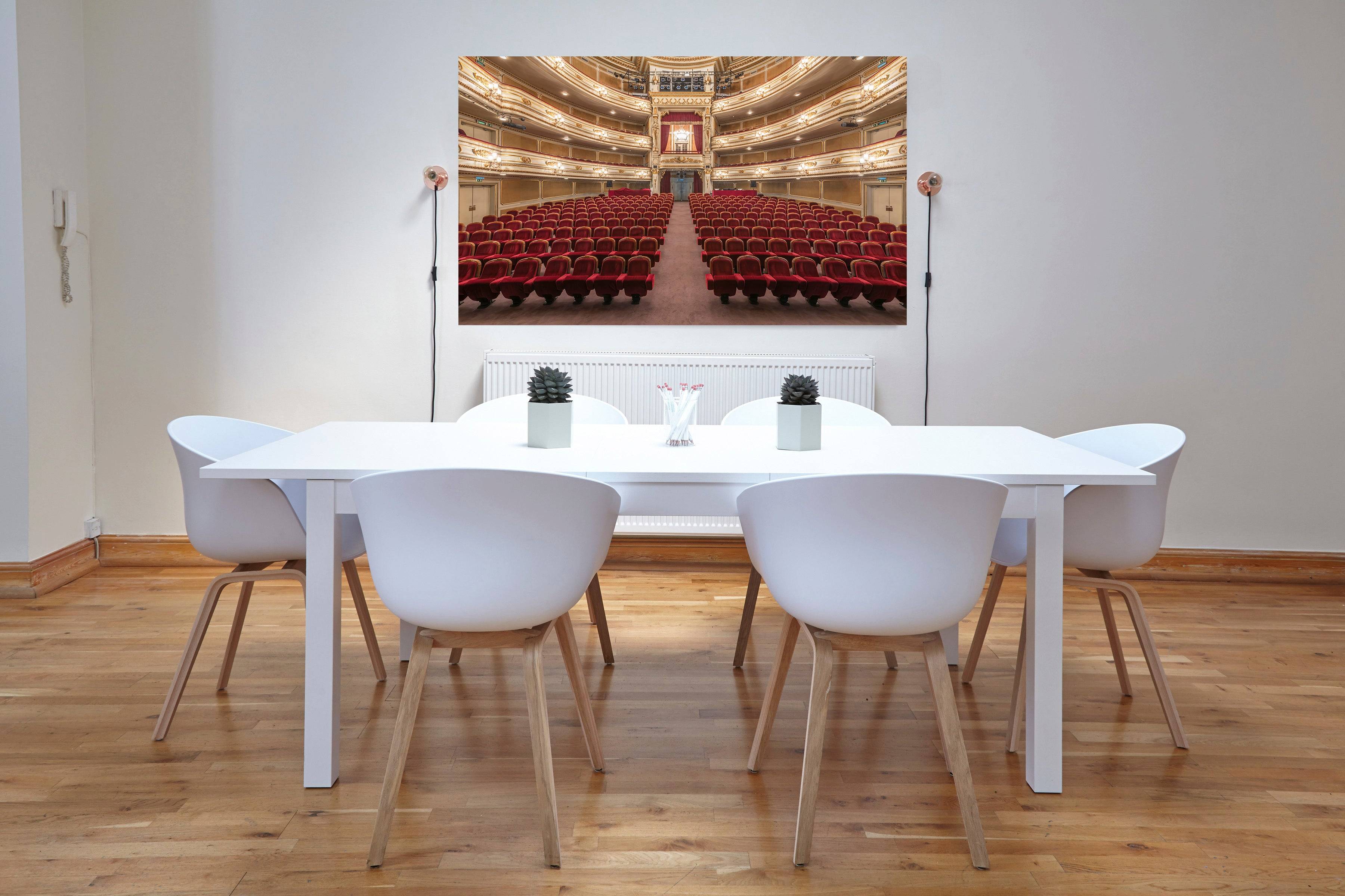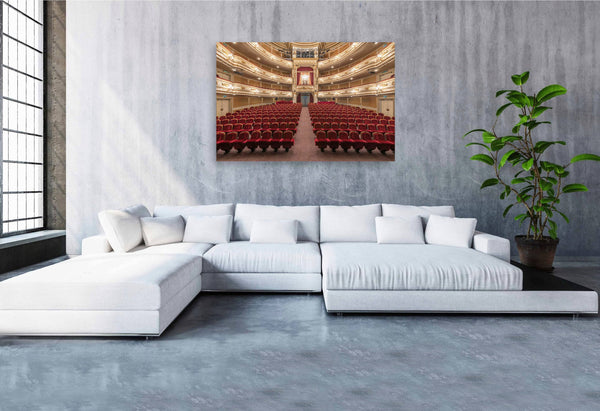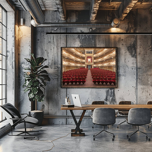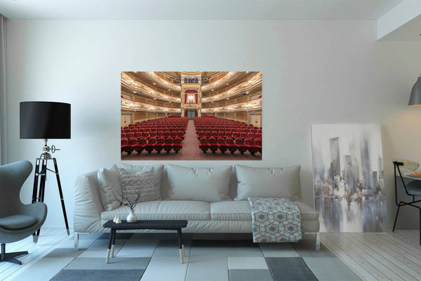 The photograph captures the vibrant, theatrical spirit and the perfectly balanced architecture of the main hall. As a piece of fine art, it serves as a powerful tribute to resilience and the performing arts, making it a bold centerpiece for a contemporary office or a cultural gallery wall.